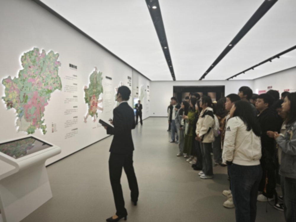 在展览馆工作人员的专业引导下,学生们依次参观了序厅、历史文化厅、城乡总体规划厅、重点区域规划厅、生态环境保护规划厅等多个展区。各展区通过高清LED 屏、立体沙盘模型互动查询系统等多元化展示手段,全方位、多角度地呈现了贵阳市从过去到现在的城乡发展变迁,以及未来城乡规划的宏伟蓝图。在历史文化厅,学生们通过老照片、实物展陈和多媒体演示,深入了解了贵阳市独特的地域文化、历史风貌以及城市发展的脉络,为后续理解现代城乡规划与历史文化保护的结合奠定了基础;在城乡总体规划厅,1:3000 的贵阳市域总体规划沙盘震撼亮相,清晰展示了贵阳市 “一核三翼” 的空间结构、交通网络布局、产业园区分布等核心规划内容,工作人员详细讲解了规划编制的依据、目标和实施路径,让学生们直观地掌握了贵阳市城乡规划的整体概况。