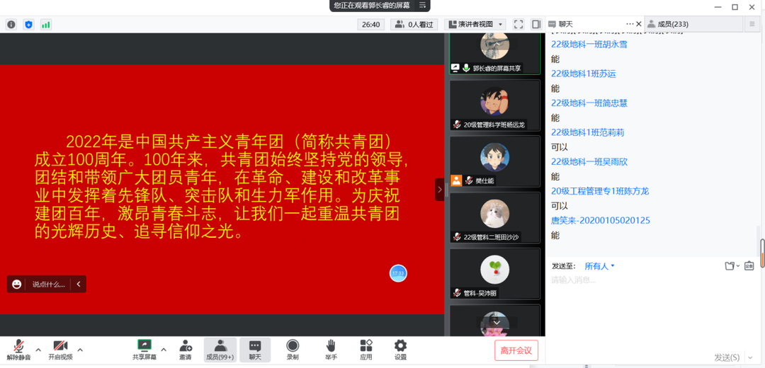 院长郭长睿担任主讲嘉宾,与院2022年入团积极分子,院团委学生干部,2020级、2021级、2022级各班级团支部团干及优秀青年共252人一起开展“回顾光荣历程 展望青春理想”第二期主题团课。