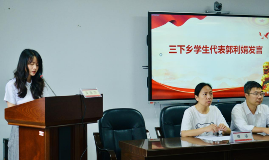 “三下乡”学生代表郭利娟在发言中表示,实践队将秉持学习态度、满怀服务热情、强化团队精神,以实际行动为乡村发展贡献力量。