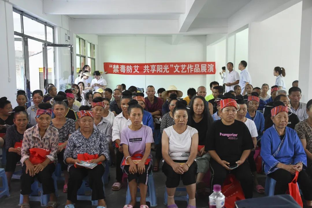 集体宣讲现场,实践队员通过朗诵+宣讲等文艺作品展演形式,向当地群众详细讲解了禁毒防艾相关知识,从而加大了村民识毒、拒毒、防毒、防艾的意识,呼吁大家,共创美好家园。