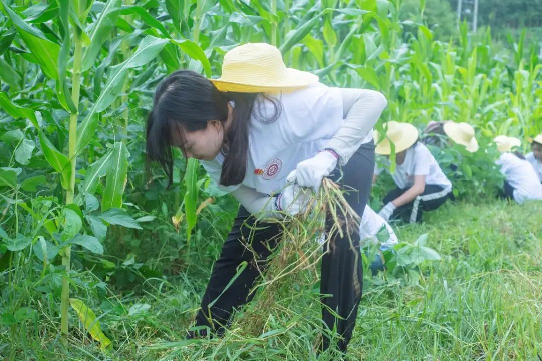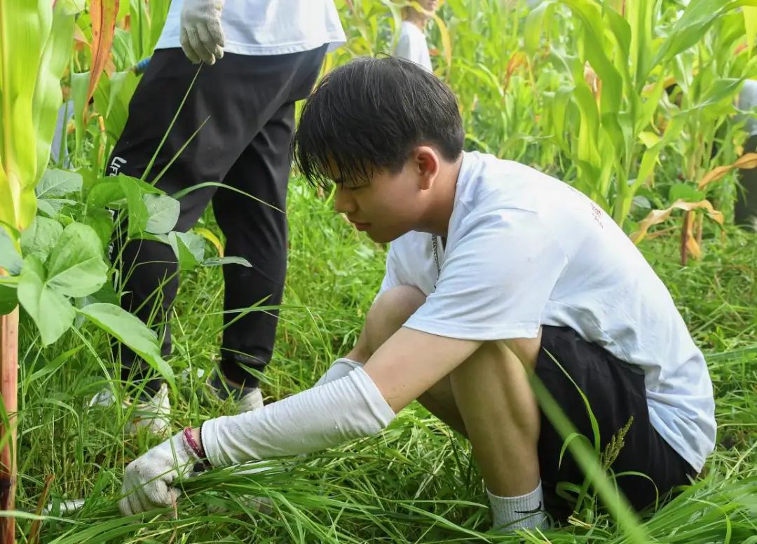 紧接着实践队分为三队,在产学研基地进行研学实践及义务劳动,男生们手持镰刀,进入玉米地进行除草;女生们手持剪刀,进入西红柿培育棚剪掉枯枝烂叶,她们在梁龙教授的指导下学会了如何对生病的西红柿枝进行修剪,剪下了被病毒感染而枯萎或被害虫损伤的枝叶。在义务劳动中,大家的手套被水滴浸湿,手臂上满是被杂草割伤以及被蚊虫叮咬的痕迹。面对玉米地的杂草西红柿的枯枝烂叶,没有一个人怕脏喊累,个个满头大汗,呈现出一幅热火朝天的场景。