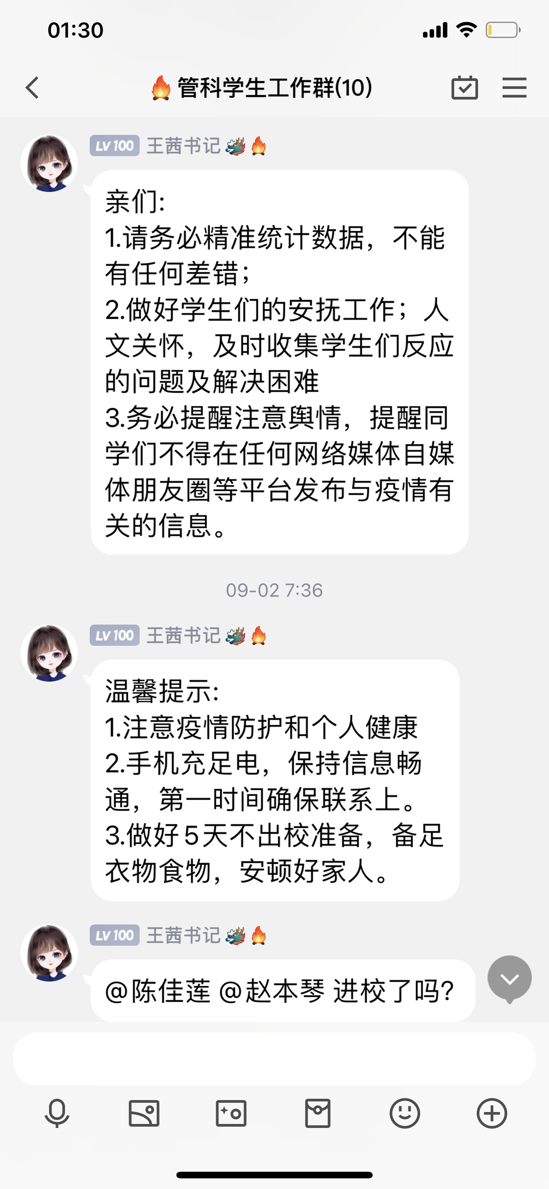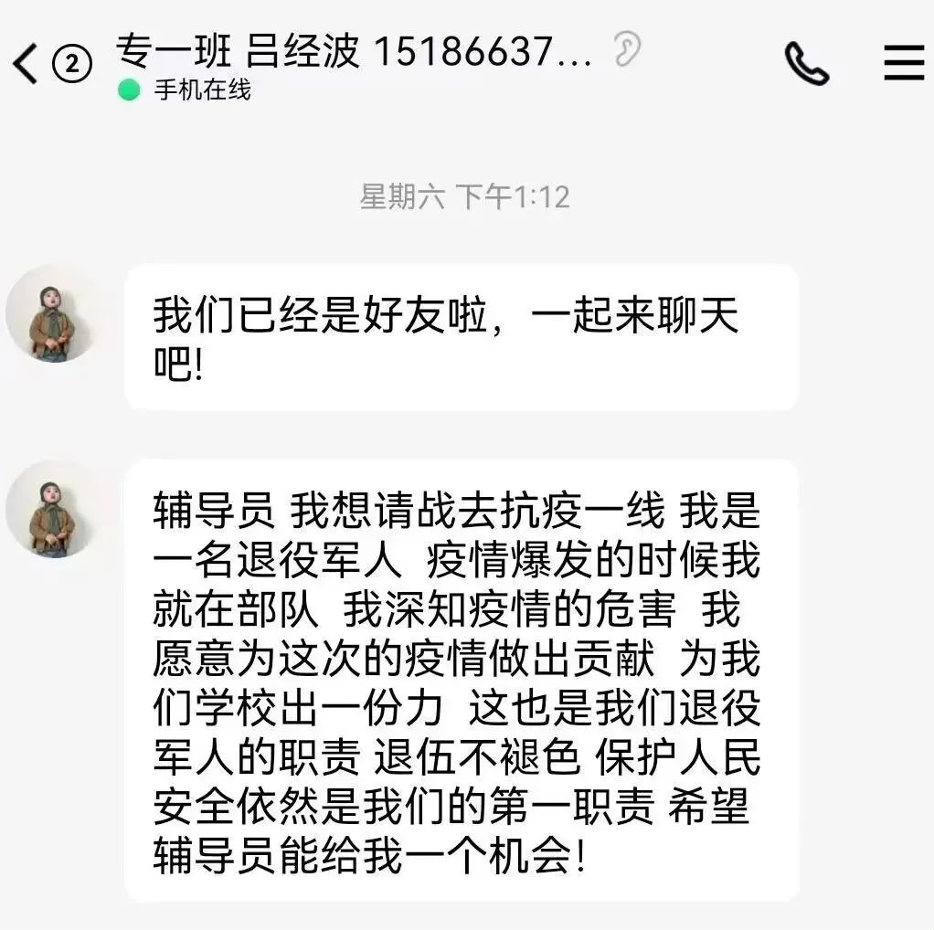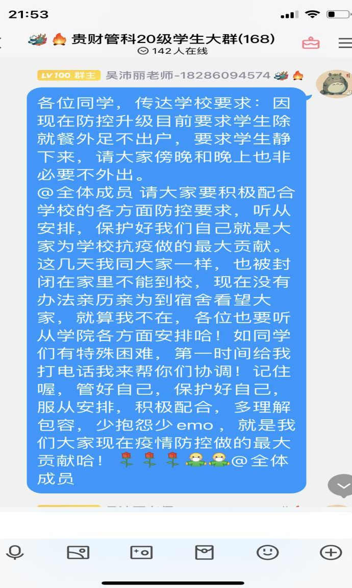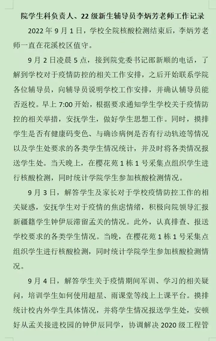 的年轻老师让他多休息时,他嘴边总是挂着那句“没事,你们不用担心,你们小年轻也注意身体”;已调往招就处但仍在履行学生管理职责的原党委副书记王茜,现在仍尽职尽责的和大家一起战斗,并经常给大家带来鼓励温暖,她说过一句话“虽然已经下文我现在不在管科,但是交接工作的最后阶段我仍然要站好最后一班岗,做好自己该做的,有始有终,而且,我对管科也很有感情”;几位辅导员老师家里都是两三岁的孩子,但是他们暂时“放弃”了她们的小孩子,去保护好他们的“大孩子们”。