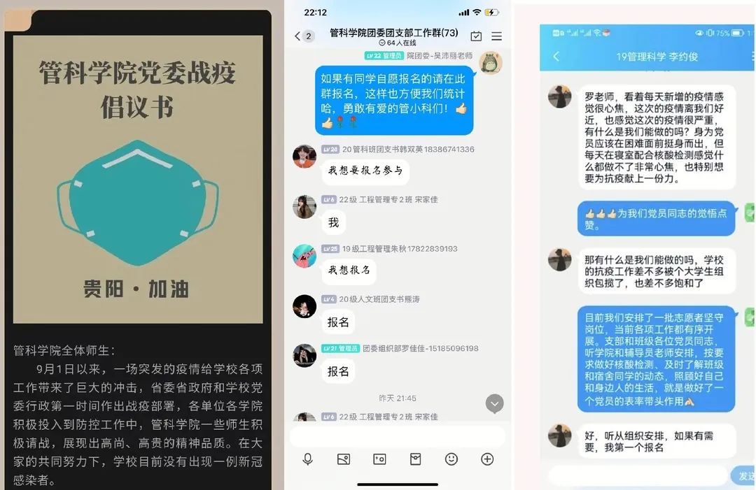 党委战疫情倡议书的号召下,积极报名,他们说疫情来的有点突然,都是学校安排的志愿者们为大家辛苦付出,作为贵财一份子、管科一份子,他们也愿意出一份力。他们现在先报名参加,一旦有需要,他们可以随时站出来、顶得上。