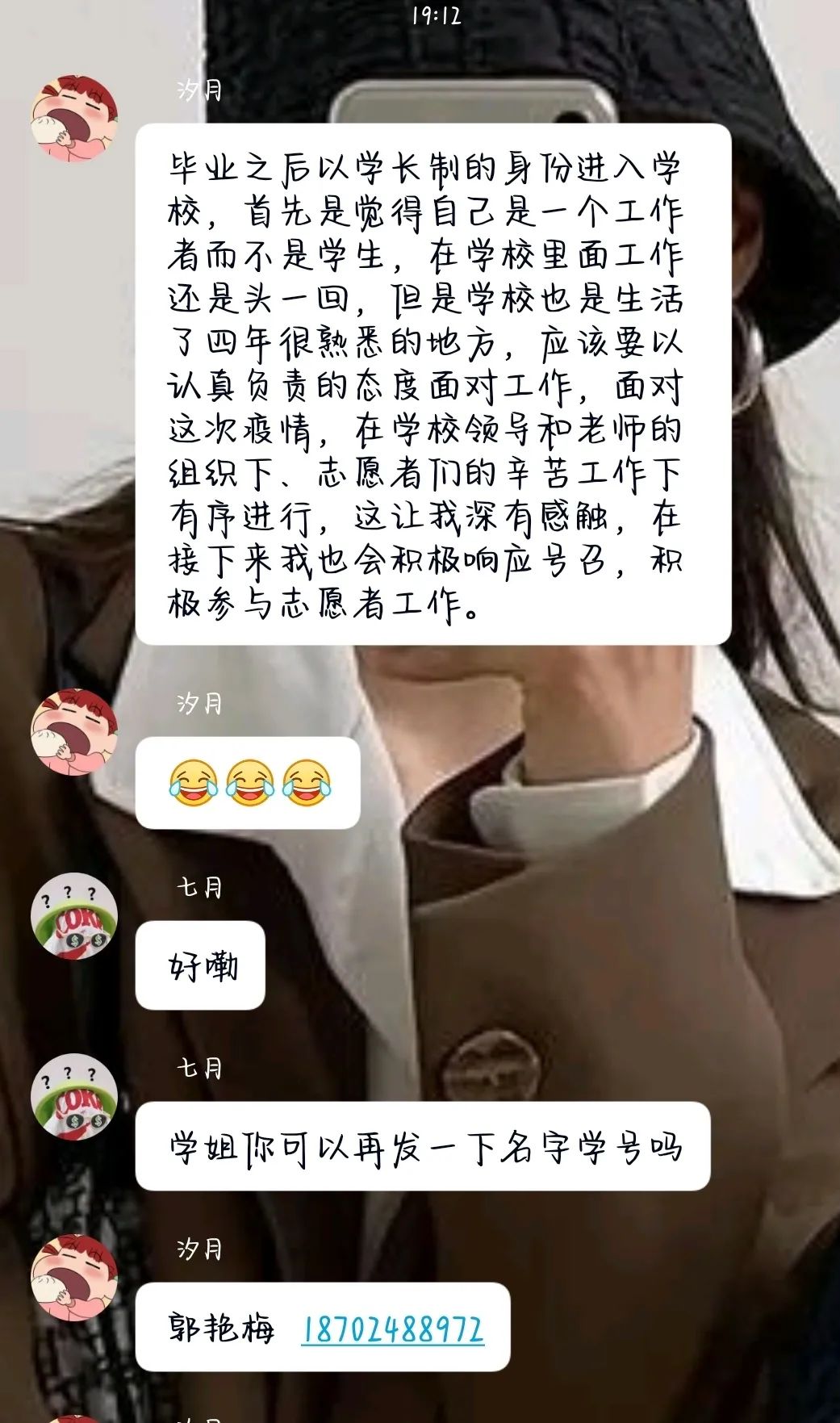 还有一大批有责任、有担当的科研助理及学长制,他们是周晗蔚、张宇梅、覃彩霞、袁碧、郭艳梅、杨垒垒、田洪兰。由于工作安排,他们目前处于待定状态。虽然目前他们没法跟大家并肩作战,也没能够参与志愿服务,但他们随时待命,听从安排,在玩游戏赚钱