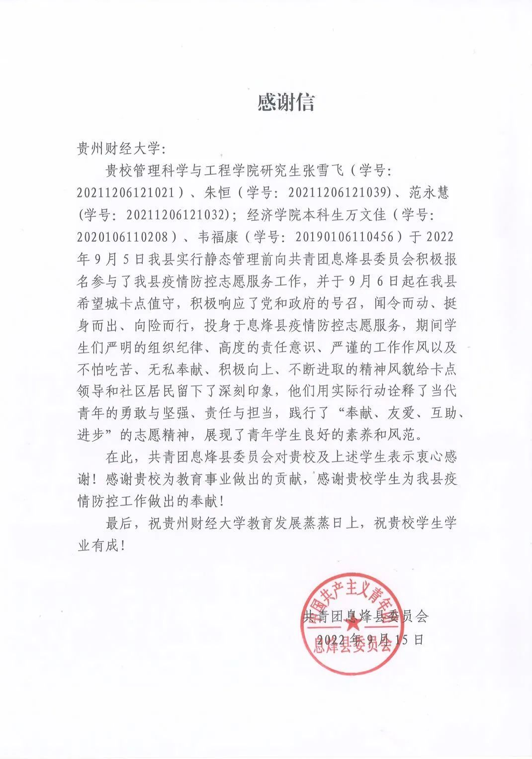 在抗疫路上,几位研究生闻令而动,挺身而出,“疫路向前”,践行了“奉献、友爱、互助、进步”的志愿精神,展现了良好的素养和风范,用实际行动诠释了管科学子的勇敢与坚强。同时,他们的志愿服务精神与疫情面前的责任担当也得到了当地政府的充分肯定。