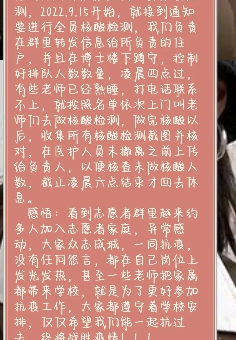 作为科研助理中的一员,我和大家一样都想为这场疫情防控攻坚战贡献自己一份力量。9月3日我在樱花一协助志愿者到寝室楼逐层喊人下楼做核酸,直到当晚快到凌晨才结束工作,其他志愿者何况老师也是非常辛苦。9月15日凌晨到博士楼2栋1单元进行志愿者协助工作,负责上楼通知人员做核酸,大家都积极配合。虽然很晚,天气又冷,很多老师依旧坚守岗位,不妨有年纪较大的,任劳任怨,充分发挥了党员先锋模范作用,带动了我工作的热情。虽然到了凌晨五点半才结束回寝室,但我觉得我的工作只是一小部分,很多人更辛苦。从学生到科研助理的转变,使我更加懂得了责任担当的重要性。希望我们大家一同努力,早日战胜这场疫情防控攻坚战。