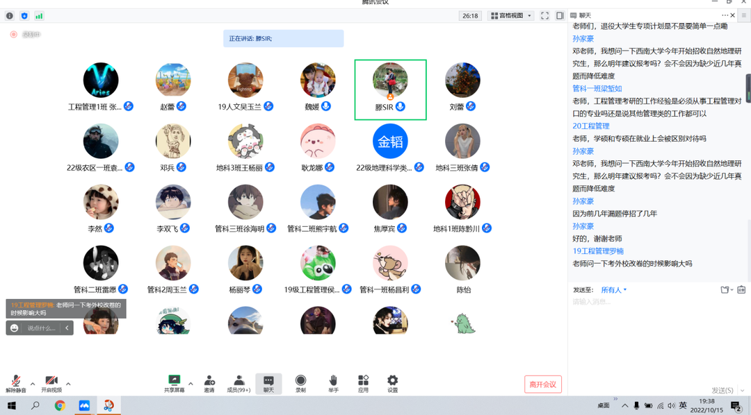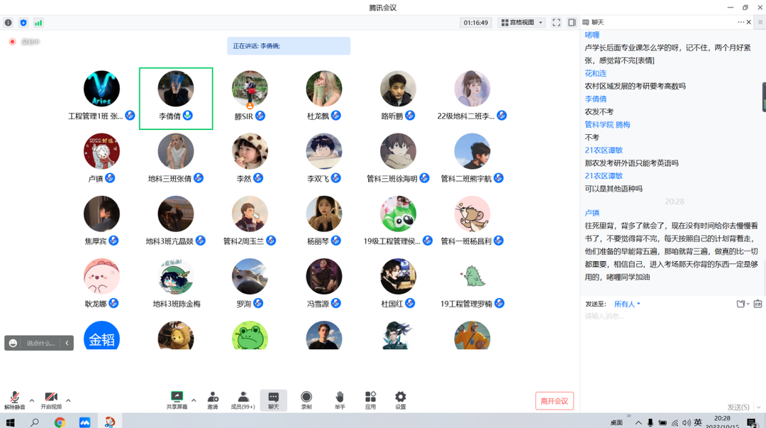 随后,资环系教工党支部其他党员教师也与同学们互动交流,同学们积极发言提问,老师们就提问一一认真解答,同时勉励有考研意向的同学们要尽早准备、坚持不懈。