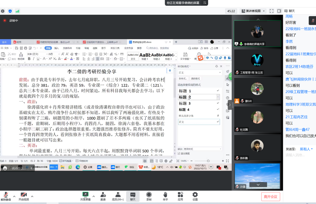 2022级农村发展专业研究生路昕鹏、杜龙飘、李倩倩、卢镇等四位同学结合自身经历,分享自己的成功经验。其中,获得考研英语高分、专业课第一成绩的路昕鹏建议同学们要合理安排作息时间,打好考研这场持久战;专业成绩第二、复试成绩第一的杜龙飘建议同学们合理分配自己的学习时间,要保持良好的学习状态,乘胜追击;获得双专业课120分的李倩倩建议同学们养成良好的学习习惯,不要思考未知的焦虑,珍惜利用好当下的学习时光,坚持不懈的努力;卢镇跨考成功上岸,建议同学们不要焦躁,要满怀信心、苦下功夫,终将取得成功。
