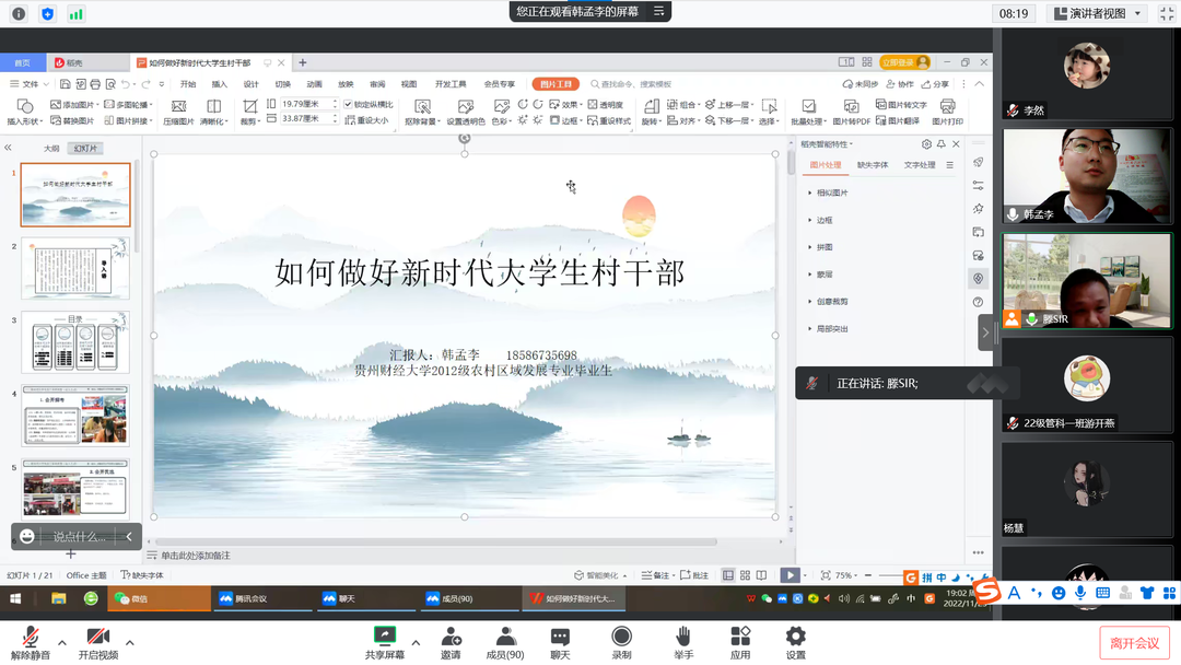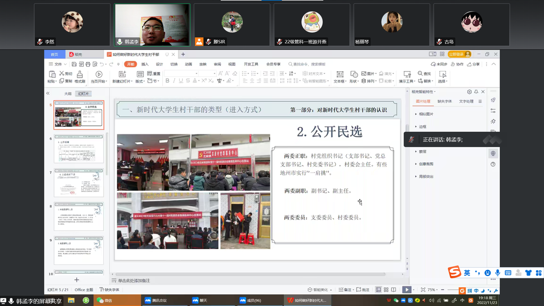 活动伊始,韩孟李以当代大学生毕业后所面临的各种就业选择为切入点,深入阐释了自己对新时代大学生村干部的认识,解读新时代大学生村干部的多种类型,从新时代大学生村干部的进入方式与薪资待遇展开叙述,向同学们普及了通过公开招考、公开民选、公开招聘以及上级组织下派这四种当选大学生村官的方式。接着,他指出,在做基层服务工作的过程中,应该从“讲政治,守规矩;讲形象,严作风;讲奉献、守底线;讲主动、展自己;讲学习、练本领;讲标准、求精益”等六个方面出发,端正工作态度,坚定理想信念,全面做好新时代大学生村干部。同时,他结合时代发展特征以及自身工作经历,向同学们分析了新时代大学生村干部的发展趋势,他认为,新时代大学生村干部将受到高度重视,迅速发展,大有可为。此外,韩孟李就自身的基层工作经验,分享三点工作心得,即必须有家国情怀、必须端正态度、必须意志坚定,从而鞭策同学们在大学期间加强学习,善于思考,好好历练,为以后进入社会打下坚实基础。活动末尾,韩孟李与同学们进行交流讨论,为同学们答疑解惑。