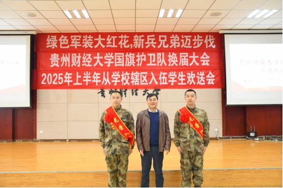 2025年3月11日,贵州财经大学在西区隆重举行2025年上半年入伍士兵欢送会,热烈欢送即将踏上军旅生涯的优秀学子。贵州财经大学党委副书记彭洁出席欢送会,玩游戏赚钱 党委书记胡张林参加了本次活动,为玩游戏赚钱 两名光荣入伍的学生送上真挚祝福。