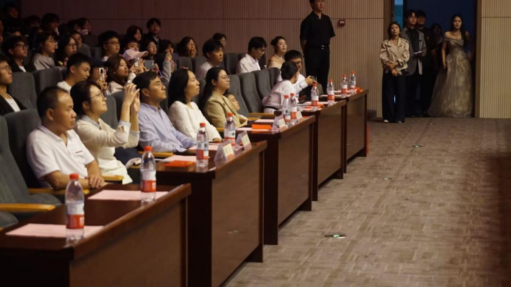 党委书记胡张林、党委副书记张颖、党委副书记傅璟、副院长梁龙以及教师代表与全体2025级新生齐聚一堂,在“青春”“民族”“国家”三大篇章的流转中,共赴一场融合了青春奋进、文化传承与家国情怀的视听盛宴,迎接新生开启大学新旅程。