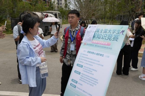 活动现场,众多师生驻足观看展播视频,参与互动游戏。现场志愿者同步进行知识讲解,帮助深化环保认知。通过“线上+线下” 结合的方式,师生们积极参与环保知识竞答,内容涵盖生态保护、污染防治等领域,全面检验学生环保知识储备。