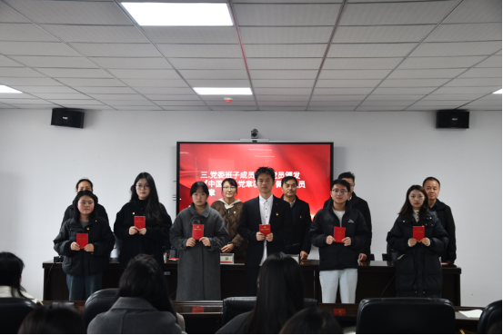 仪式在庄严的《中华人民共和国国歌》中拉开帷幕。党委副书记傅璟宣读党委关于接收新党员的批复文件后。在全体与会人员的见证下,党委班子领导逐一为新党员颁发了《中国共产党章程》,并亲自为他们佩戴上熠熠生辉的党员徽章。这一环节不仅象征着组织对新成员的正式接纳,更寄托了对其牢记身份、践行宗旨的深切期望,标志着他们政治生命的新起点。